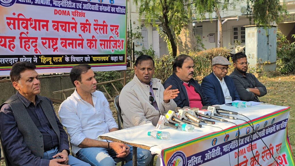 नई दिल्ली। दलित, ओबीसी, माइनॉरिटीज और आदिवासी संगठनों का परिसंघ (डोमा परिसंघ) पूर्व सांसद और राष्ट्रीय चेयरमैन-डॉ. उदित राज ने कहा कि आज प्रेस वार्ता के माध्यम से देशवासियों को संविधान दिवस की शुभकामनाएँ दी और कहा कि एक तरफ़ संविधान दिवस मनाया जा रहा है तो दूसरी तरफ़ सत्ता में बैठी शक्तियां इसे कमजोर करने में लगी हैं। ऐसा प्रमाणित भी हो रहा है। डोमा परिसंघ ने 30 नवंबर को दिल्ली की रामलीला मैदान में संविधान और वोट बचाने की रैली करने का निर्णय लिया था, लेकिन दिल्ली पुलिस ने एनओसी देने से इनकार कर दिया।
